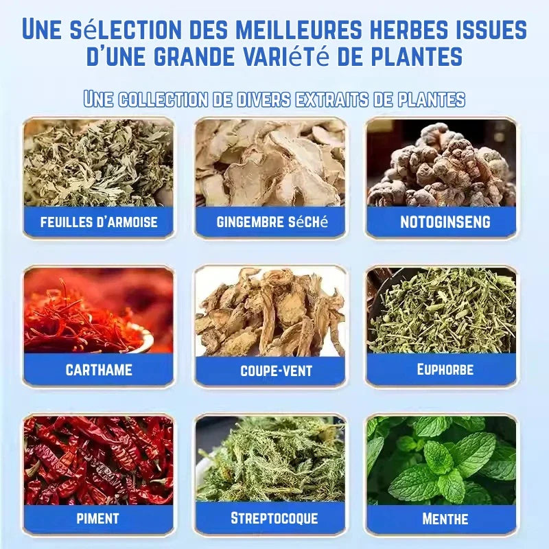 Une sélection d’herbes traditionnelles reconnues pour leurs effets chauffants et apaisants. Pas de chimie agressive — la force des plantes, concentrée pour un impact maximal. Naturel, mais loin d’être doux contre la douleur.