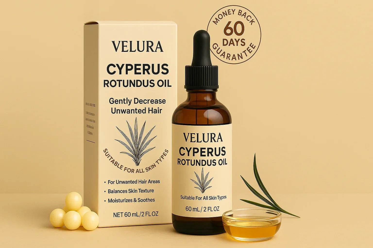 VELURA Cyperus Rotundus Oil pénètre au cœur du follicule, ralentit la repousse, adoucit la peau et lisse le grain cutané jour après jour.